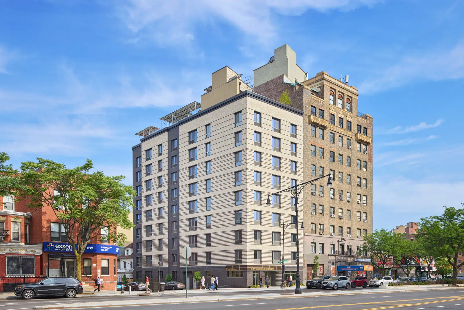 2017 Grand Concourse is a 9-story, 26,239-square-foot affordable housing building in the Bronx. The structure contains 34 residential units—ranging from studios to two-bedrooms—serviced by an all-electric HVAC system featuring high-efficiency packaged terminal heat pumps and passive ventilation for superior air quality. While individual room numbers are not publicly listed in architectural summaries, the building is officially identified by its address and features a modern brick facade that integrates seamlessly with the historic Art Deco character of the Grand Concourse.